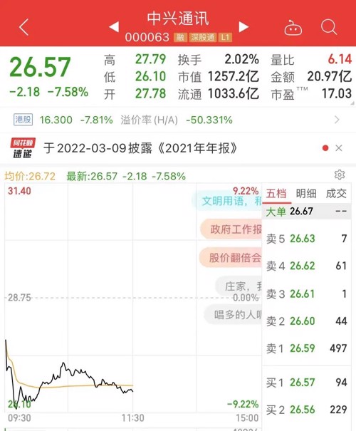 5G通讯龙头股,1000多亿市值的中兴通讯大跌超7%。