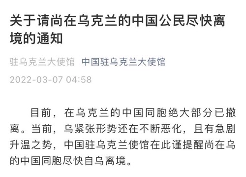 中国驻乌克兰大使馆3月7日凌晨发布,目前,在乌克兰的中国同胞绝大部分已撤离。当前,乌紧张形势还在不断恶化,且有急剧升温之势,中国驻乌克兰使馆在此谨提醒尚在乌的中国同胞尽快自乌离境。