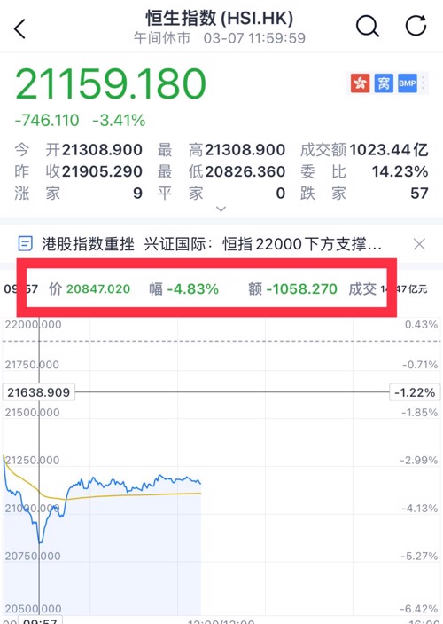 港股恒生指数、恒生科技指数开盘就大幅低开,恒生指数一度暴跌1000点,指数都跌超3%,恒生科技指数上午一度暴跌近6%。