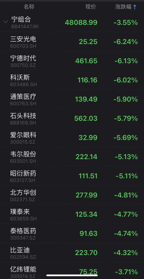 宁组合大跌3.55%,三安光电、科沃斯也跌超6%,通策医疗、爱尔眼科、石头科技等纷纷大跌。