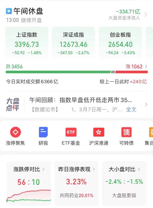 上午收盘,上证指数跌1.48%,深证成指跌2.67%,创业板指数重挫3.43%,科创50指数跌2.14%,个股3456只下跌,1062只上涨,两市成交额6390亿元。