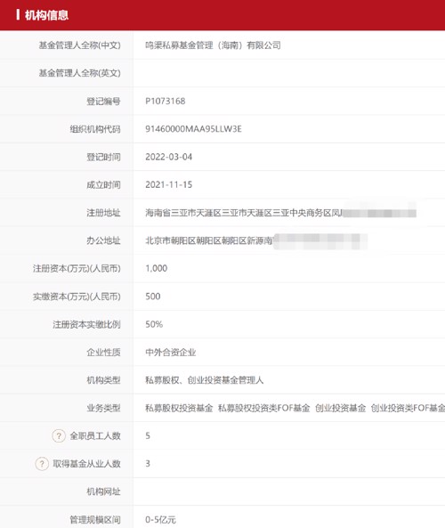 这家新锐私募成立于2021年11月15日,注册资本1000万元人民币,实缴资本500万元人民币,目前该公司共有5名全职员工,注册地在海南三亚,办公地在北京朝阳区。