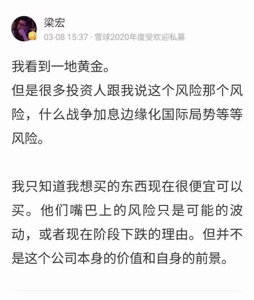 百亿私募希瓦创始人梁宏在社交平台上发文:我看到一地黄金。但是很多投资人跟我说这个风险那个风险,什么战争加息边缘化国际局势等等风险。我只知道我想买的东西现在很便宜可以买。他们嘴巴上的风险只是可能的波动,或者现在阶段下跌的理由。但并不是这个公司本身的价值和自身的前景。