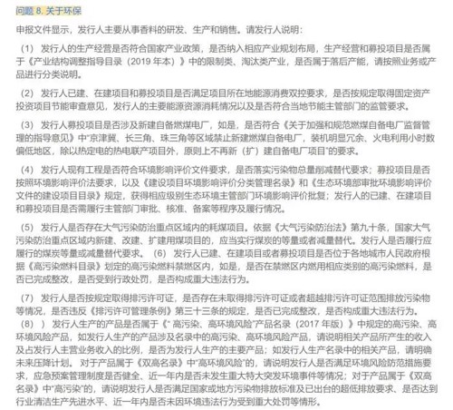在第8条有关环保的问题中,监管一共问询了10个小问题,其中第6-8问对“高污染”话题进行了重点询问。例如第8小问,监管问询,发行人生产的产品是否属于《“ 高污染、高环境风险”产品名录(2017 年版)》中规定的高污染、高环境风险产品,如发行人生产的产品涉及名录中的高污染、高环境风险产品,请说明相关产品所产生的收入及占发行人主营业务收入的比例,是否为发行人生产的主要产品;如发行人生产名录中的相关产品,请明确未来压降计划。对于产品属于《双高名录》中“高环境风险”的,请说明发行人是否满足环境风险防范措施要求,应急预案管理制度是否健全、近一年内是否未发生重大特大突发环境事件等情况;对于产品属于《双高名录》中“高污染”的,请说明发行人是否满足国家或地方污染物排放标准及已出台的超低排放要求、是否达到行业清洁生产先进水平、近一年内是否未因环境违法行为受到重大处罚等情形。