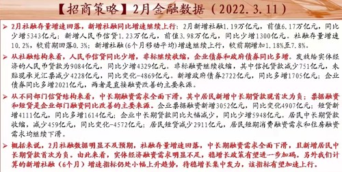 招商策略点评称,2月社融数据明显不及预期,存量增速回落,中长期融资需求全面下滑,且新增居民中长期贷款首次为负,由此看来,实体经济融资需求明显不足,稳增长政策有望进一步加码。