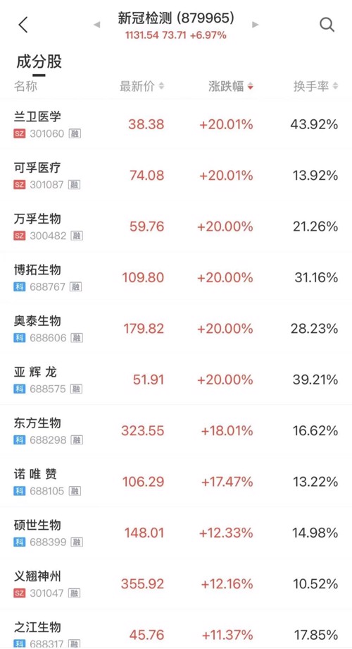 东方生物涨逾18%,诺唯赞涨逾17%,硕世生物、义翘神州、之江生物、热景生物涨逾11%,北化股份、贝瑞基因、九安医疗等多股涨停。在今日的9只“20CM”涨停股中,新冠检测概念股占了6只,除兰卫医学为早盘直线涨停外,其他5只新冠检测概念股均为午后直线拉升至涨停。