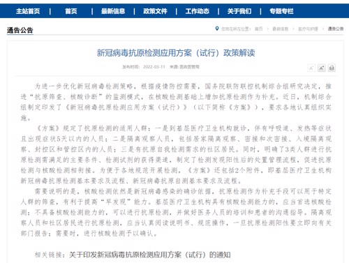 11日傍晚,据国家卫健委,经研究,国务院应对新型冠状病毒肺炎疫情联防联控机制综合组决定在核酸检测基础上,增加抗原检测作为补充,并组织制定了《新冠病毒抗原检测应用方案(试行)》。