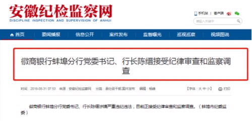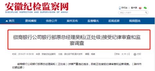此外,据安徽纪检监察网公开信息,2019年7月,徽商银行公司银行部原总经理吴耘(正处级)涉嫌严重违纪违法接受纪律审查和监察调查。同年8月,徽商银行蚌埠分行党委书记、行长陈缙涉嫌严重违纪违法接受纪律审查和监察调查。