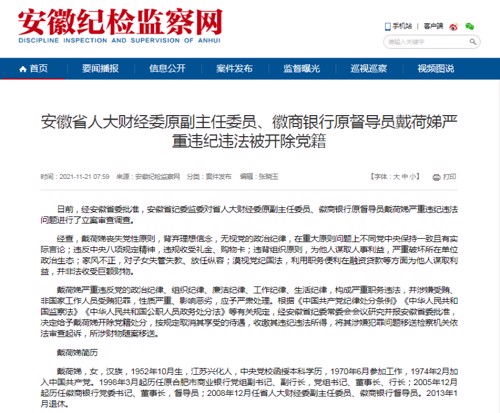 2021年11月,安徽纪检监察网发布公告,经安徽省委批准,安徽省纪委监委对省人大财经委原副主任委员、徽商银行原督导员戴荷娣严重违纪违法问题进行了立案审查调查。