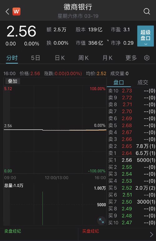 截至3月18日收盘,徽商银行横盘,每股报2.56港元。