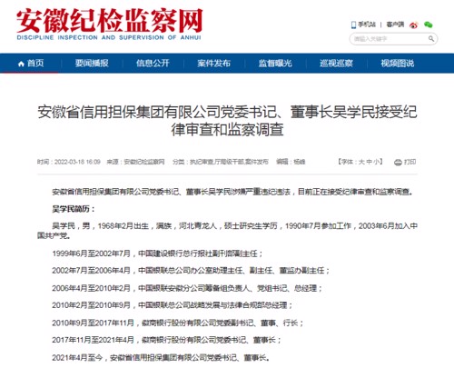 3月18日,安徽纪检监察网发布公告,安徽省信用担保集团有限公司党委书记、董事长吴学民涉嫌严重违纪违法,目前正在接受纪律审查和监察调查。