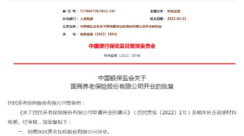 3月22日下午,银保监会发文批准国民养老保险股份有限公司(下称“国民养老保险公司”)开业,这是国内获批开业的第10家养老险公司。
