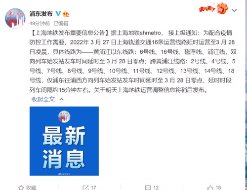 此外,上海地铁重要信息公告, 接上级通知:为配合疫情防控工作需要,2022年 3 月 27 日上海轨道交通16条运营线路延时运营至3 月 28 日凌晨,具体线路为——黄浦江以东线路:6号线、16号线、磁浮线、浦江线,双向列车始发站发车时间延时至 3 月 28 日零点;跨黄浦江线路:2号线、4号线、5号线、7号线、8号线、9号线、10号线、11号线、12号线、13号线、14号线、18号线,仅浦东往浦西方向列车始发站发车时间延时至 3 月 28 日零点,延时时段列车间隔约15分钟左右。关于明天上海地铁运营调整信息将稍后发布。