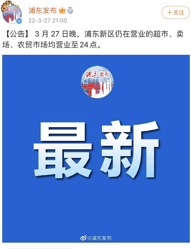 据@浦东发布,3月27日晚,上海浦东新区仍在营业的超市、卖场、农贸市场均营业至24点。
