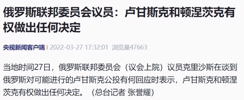 当地时间27日,俄罗斯联邦委员会(议会上院)议员克里沙斯在谈到俄罗斯对可能进行的卢甘斯克公投有何回应时表示,卢甘斯克和顿涅茨克有权做出任何决定。