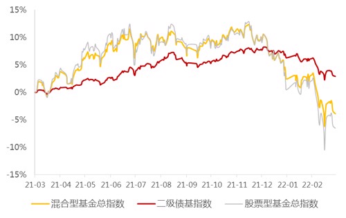 和权益类基金相比,二级债基的抗风险能力则更优秀,这一点在震荡市中尤为可贵。图4可以看出,近1年混合型基金指数与股票型基金指数走势犹如“过山车”,波动剧烈。而二级债基指数虽然也会受到市场的影响,但因为有债券类资产打底,贡献基础收益,提供一定安全垫,走势则相对平缓很多。截至2022年3月28日,近1年混合型基金、股票型基金的平均收益均为负数,分别是-3.55%、-5.44%,而二级债基近1年平均收益为2.84%。