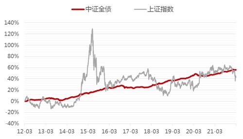 股市与债市在多数时间里会呈现出“跷跷板”效应。图2展示了中证全债指数和上证指数近10年的走势,在上证指数出现剧烈波动、大幅回撤期间,中证全债指数表现稳定,整体还保持着增长趋势。