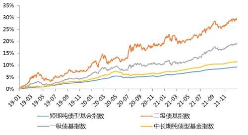 纯债型基金,专门投资于债券,不投资股票、权证等。根据久期长短又可以进一步分为短期纯债型基金、中长期纯债型基金。 一级债基,主要投资于债券,但是部分资产可通过一级市场打新投资股票(现已被叫停),或投资可转债。 二级债基,主要投资于债券,除此之外,可在20%的比例范围内参与二级市场股票交易。二级债基近几年人气颇高。作为“固收+”基金的旗舰产品,二级债基进可攻退可守,拥有“攻守兼备”的相对优势。