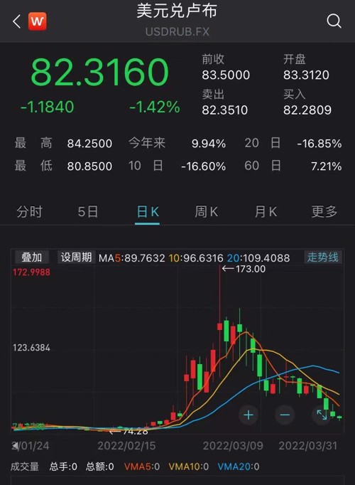 受此推动,卢布自3月7日创下历史新低后,一路反攻,重回80附近。
