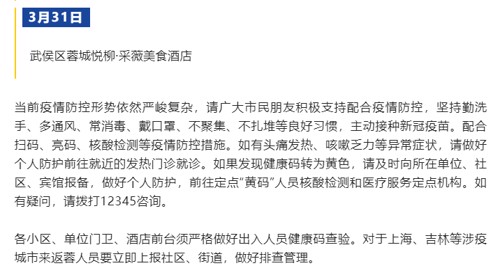 各小区、单位门卫、酒店前台须严格做好出入人员健康码查验。对于上海、吉林等涉疫城市来返蓉人员要立即上报社区、街道,做好排查管理。