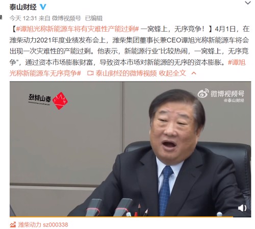 4月1日,在潍柴动力2021年度业绩发布会上,潍柴集团董事长兼CEO谭旭光称新能源车将会出现一次灾难性的产能过剩。他表示,新能源行业“比较热闹,一窝蜂上,无序竞争”,通过资本市场膨胀财富,导致资本市场对新能源的无序的资本膨胀。