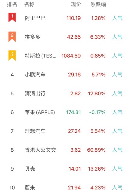 纳斯达克 100的四只成份股中,网易、百度、拼多多、京东分别收涨逾6.8%、6.5%、6.3%和2.1%。其他热门中概股中,每日优鲜收涨近14%,贝壳找房涨超13%,网易有道涨超9%,B站涨近8%,好未来涨超7%,富途控股涨超6%,爱奇艺、新东方涨超5%,知乎涨近5%,微博涨超4%,悦刻电子烟涨近4%,唯品会涨超3%,腾讯音乐涨超2%,阿里巴巴、金山云涨超1%,老虎证券涨约1%。