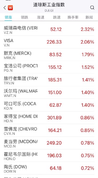 威瑞森电信涨2.32%,VISA涨2.06%,纷纷领涨道指。