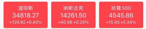 在俄乌局势及经济数据的复杂影响下,美股三大股指盘中不止一次转跌,但最终集体小幅收涨。截至收盘,道琼斯指数涨0.40%,报34818.27点;纳斯达克指数涨0.29%,报14261.50点;标普500指数涨0.34%,报4545.86点。本周,道指跌0.12%,标普500指数涨0.06%,纳指涨0.65%。