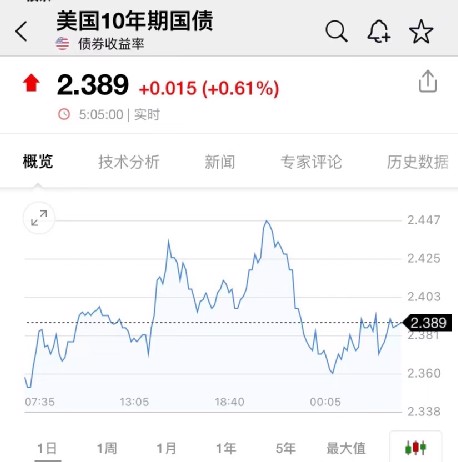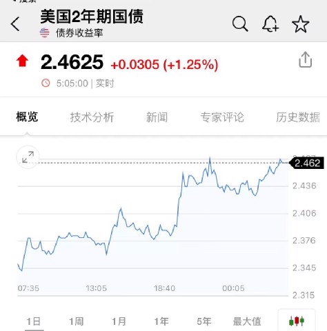 两年期美债收益率涨12.19个基点,报2.4564%,美股早盘曾涨至日高2.4665%,本周累涨13.68个基点;美国10年期基准国债收益率涨4.42个基点,报2.3822%。截至收稿,涨幅扩大。