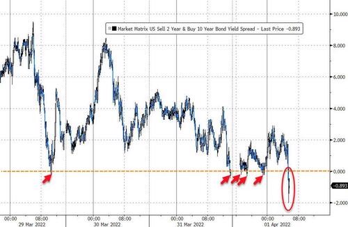 继周二(3月30日)自2019年8月以来首次倒挂后,最受关注的衰退预测指标——2年与10年期美债收益率曲线本周第二日倒挂;2年与30年期美债收益率曲线自2007年来首次倒挂。