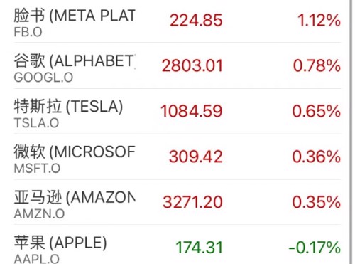 万得美国TAMAMA科技指数涨0.36%,特斯拉涨0.65%,微软涨0.36%,苹果跌0.17%,亚马逊涨0.35%,奈飞跌0.3%,谷歌涨0.78%,脸书涨1.12%。