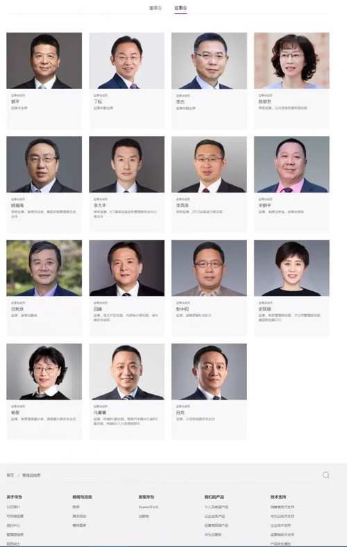 目前,华为公司当前监事会成员为:郭平、丁耘、李杰、姚福海、李英涛、陈黎芳、宋柳平、任树录、李大丰、田峰、彭中阳、史延丽、杨黎、马箐箐、吕克。