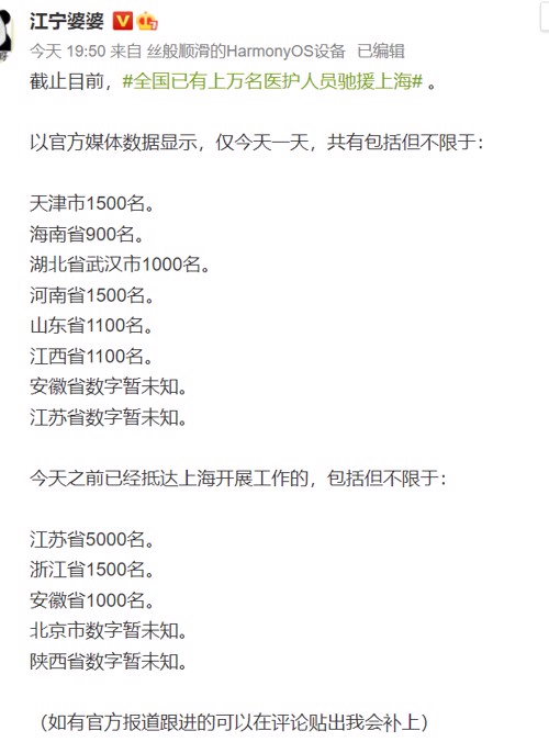 据新华社报道,3日从上海市卫健委了解到,全国多地援助上海的医疗队总人数约一万人,于近日分批抵达上海,其中部分医疗队已入驻方舱医院,准备接收新冠肺炎轻症患者和无症状感染者。