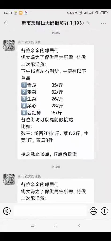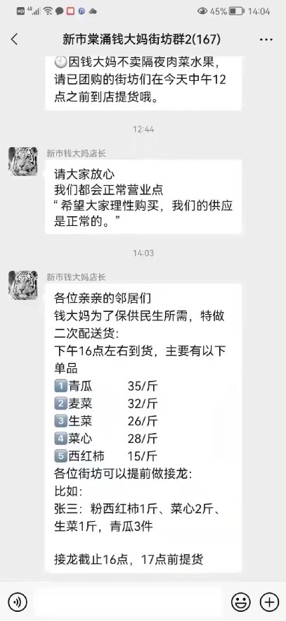 就在此时,4月9日下午两张“新市棠涌钱大妈街坊群”的微信截图疯传,其中显示“新市钱大妈店长”称,“钱大妈为了保供民生所需,特做二次配送货”,让大家接龙并提醒,“接龙截止16点,17点提货”。