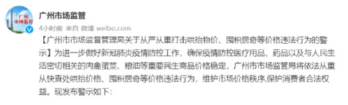 事实上,就在4月9日中午,广州市市场监督管理局通过官方微博发布了关于从严从重打击哄抬物价、囤积居奇等价格违法行为的警示。