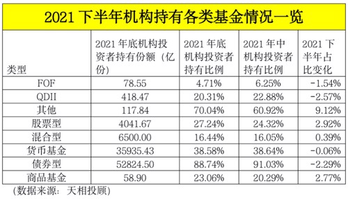 机构投资者在2021年下半年持有比例下滑较多的是QDII基金和债券型基金,去年底分别持有20.31%、88.74%,而下半年下滑了2.57个百分点、2.29个百分点。此外,去年下半年机构投资者持有货币基金的占比也微幅下滑。