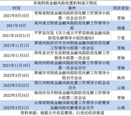 据记者不完全统计,此前已有青海省、云南省及福建省泉州市、宁夏平罗县、陕西省韩城市等地召开财政金融风险防范化解工作领导小组会议,意味着相关机制已成立。其中,青海是第一个建立财政金融风险处置机制的省份。