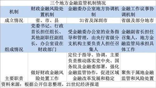 在地方党政主要领导负责的财政金融风险处置机制建立后,涉及地方金融监管和风险处置的机制还有金融委办公室地方协调机制、金融工作议事协调机制。三者既有分工,也有合作,未来在处置金融风险、服务实体经济、加强地方金融监管等方面将发挥重要作用。