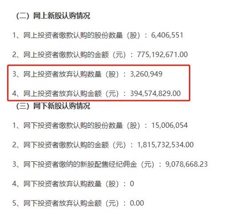 网友说,第一次见到这种场景。经纬恒润公告显示,超1/3的网上中签投资者(基本都是散户)大弃购,网上总共发行966.75万股,就有326.0949万股被弃购了,中签了,不要了。不过网下机构为主的投资者,还是没人弃购,0元弃购。