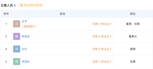 目前弘懿投资披露的主要人员有4位,其中庄宇为公司实控人,同时庄宇也是天津富联新管理咨询有限责任公司的实控人、执行董事、经理。