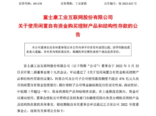 公告显示,工业富联董事会于2022年3月22日召开第二届董事会第十九次会议,审议通过了《关于使用闲置自有资金购买理财产品和结构性存款的议案》,同意公司及公司子公司使用最高额度不超过476亿元人民币的闲置自有资金投资银行、银行理财子公司等金融机构发行的安全性高、流动性好、中短期(不超过一年)、保本的理财产品和结构性存款,在上述额度范围内,资金可以滚动使用。