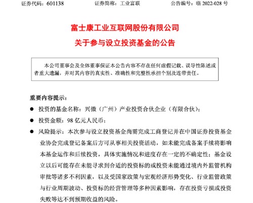 近期,工业富联动作频频,除了投资私募外,还豪掷百亿元做起了LP。3月29日,工业富联公告称,公司于3月25日与智路资本签订了《合伙协议》,公司作为有限合伙人认缴兴微基金基金份额98亿元,资金来源为公司自有资金。