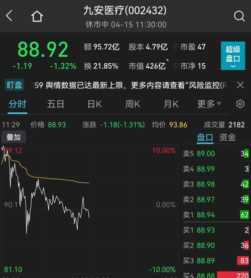 不仅以岭,另外一只大牛股九安医疗也跌了。早盘刚开盘时,九安医疗一度触及涨停,续创历史新高,随后一路走低,收跌1.32%。成交额超95亿元。