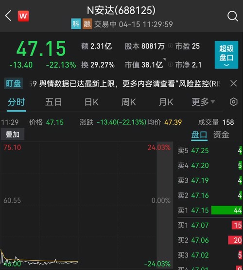 今天,N安达(安达智能)一开盘就破发,随后一路走低,收跌超22%。最新股价47.15元每股,发行价格60.55元/股,发行市盈率为39.59倍,按照中一签500股计算,亏6700元。