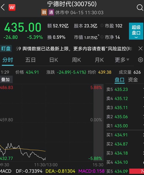 宁德时代早盘跌超5%,最新市值1.01万亿元。