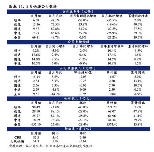从快递公司公告来看, 2月,顺丰业务量 6.38 亿件(同比 -8.33%),1-2 月量 16.27 亿件(同比+2.01%),收入 98.49 亿元(同比-3.36%),单价 15.44 元(同比+5.46%、环比减少 2.03 元)。