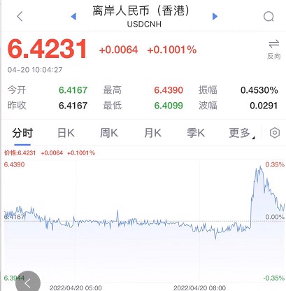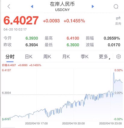 汇市方面,4月20日,在岸人民币对美元汇率开盘大幅下挫近300点,跌破6.38、6.39、6.40三道关口,与此同时,离岸人民币对美元直线走底,一度逼近6.44大关。