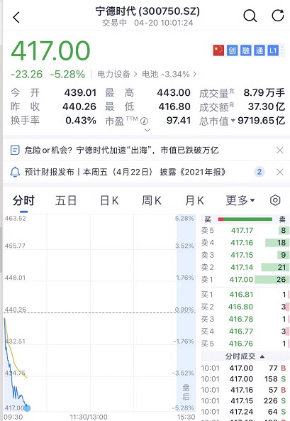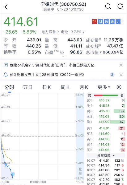 宁德时代跳水,跌破万亿市值。