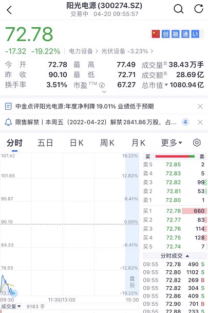 阳光电源财报出来之后,开盘就崩了20%