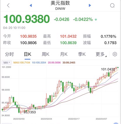 美联储要大力“收水”之际、坚持宽松的日本央行货币立场更加打击日元,日元兑美元汇率跌至2002年来低谷,并创有纪录以来最长连跌日;美元指数继续刷新两年来高位,两年来首次盘中上破101.00